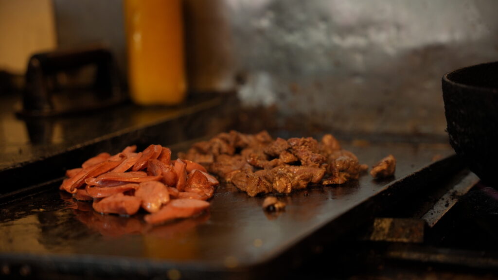 Carnes sendo preparadas na chapa de um restaurante.