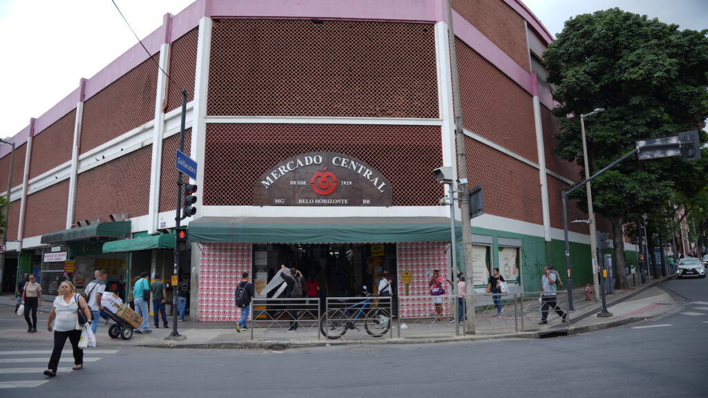 Fachada da entrada do Mercado Central, localizado na região central de Belo Horizonte, Minas Gerais. Pessoas transitam pela calçada e carros pelas ruas.