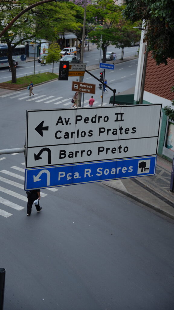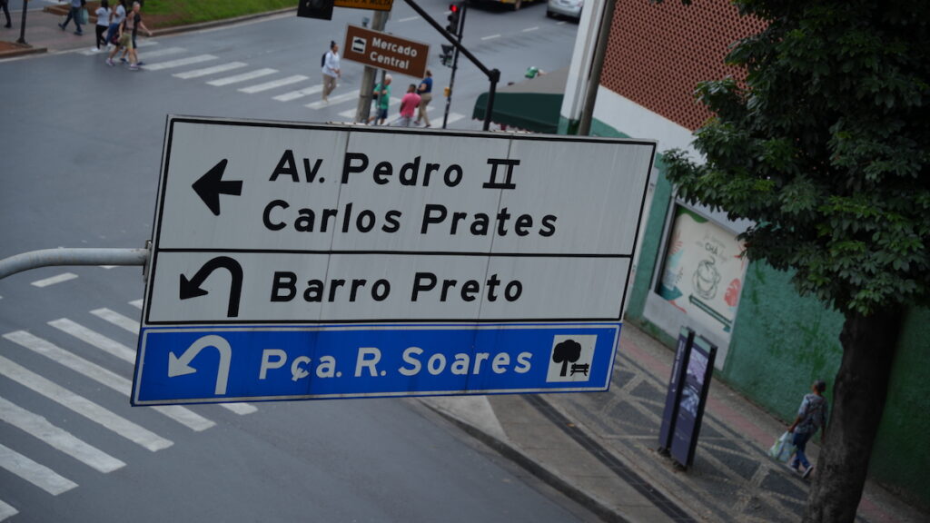 Placa indica as direções da Avenidas Pedro II, dos bairros Carlos Prates, Barro Preto e da Praça Raul Soares, localizados em Belo Horizonte, Minas Gerais. Ao fundo, um semáforo com a luz vermelha acesa, pessoas transitando pelas faixas de pedestre, carros transitando pelas ruas e uma placa indicando a localização do Mercado Central, na região […]