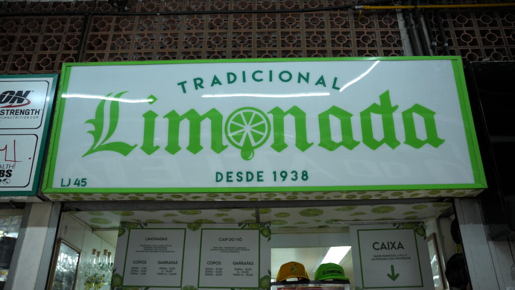 Fachada do estabelecimento “Tradicional limonada”, no Mercado Central, na região central de Belo Horizonte, Minas Gerais. Placas mostram os produtos e seus respectivos preços, além de uma placa indicando onde é o caixa. Bonés personalizados do restaurante são expostos.