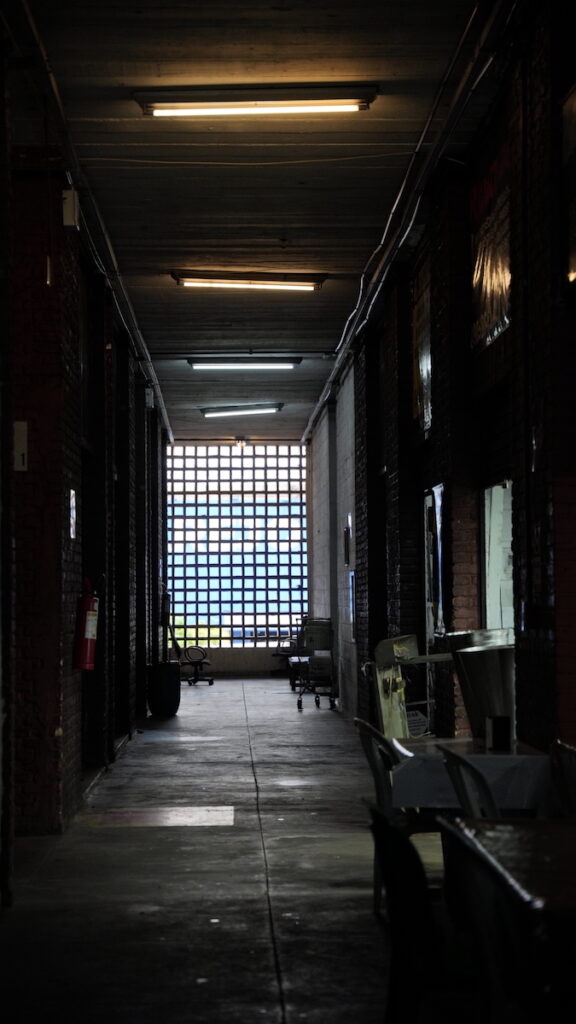 Vista interna em contraluz dos corredores do Mercado Novo, localizado na região central de Belo Horizonte, Minas Gerais. Em segundo plano, os cobogós que compõem a fachada do edifício.