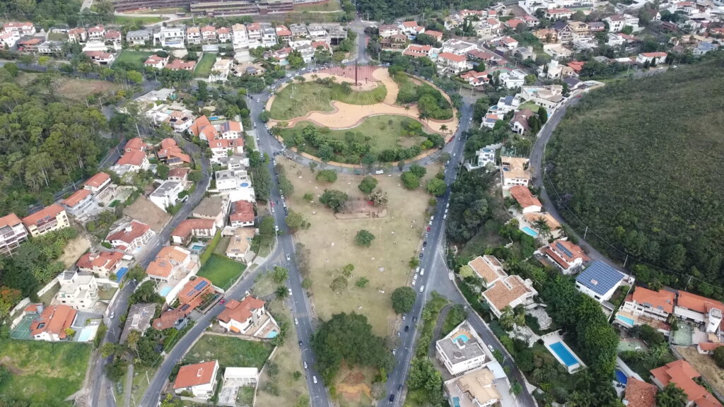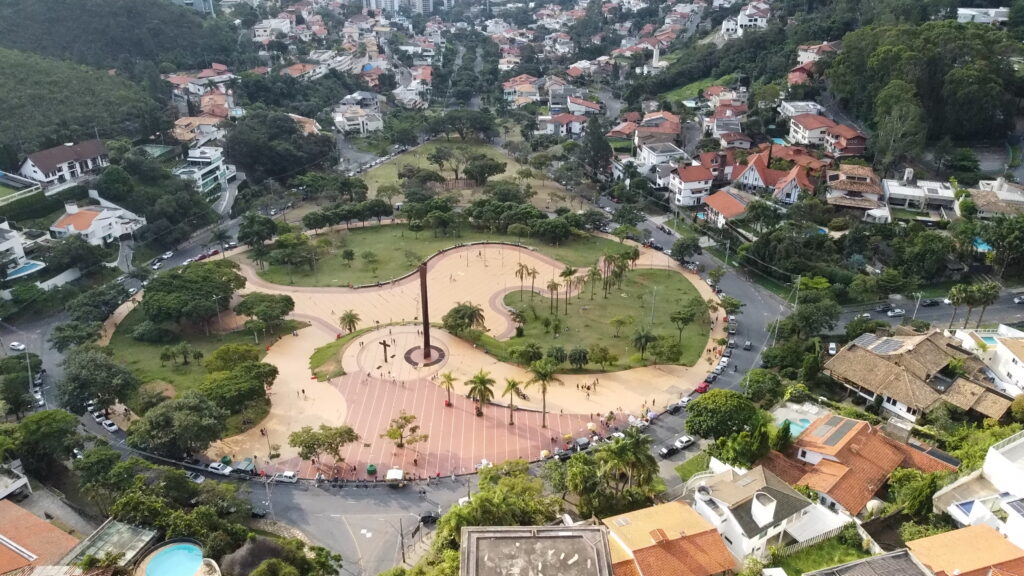 Vista aérea da Praça do Papa, em Belo Horizonte, Minas Gerais. Em primeiro plano estão as ruas que dão acesso à praça e as casas do bairro Mangabeiras que ficam no entorno da praça.