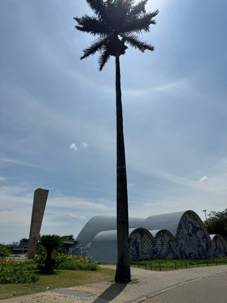 Fachada da Igreja São Francisco de Assis, na Pampulha, em Belo Horizonte, Minas Gerais. A foto mostra uma Palmeira em primeiro plano.