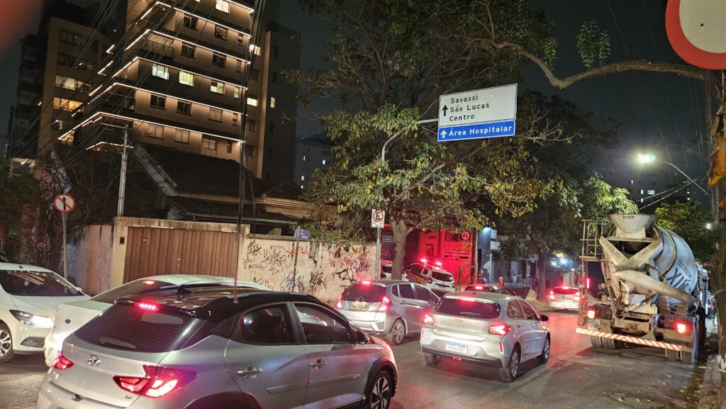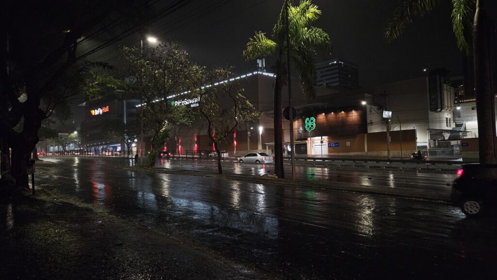 Chuva à noite em Belo Horizonte. Em primeiro plano, a avenida Nossa Senhora do Carmo, Pátio Savassi e BeFly Hall