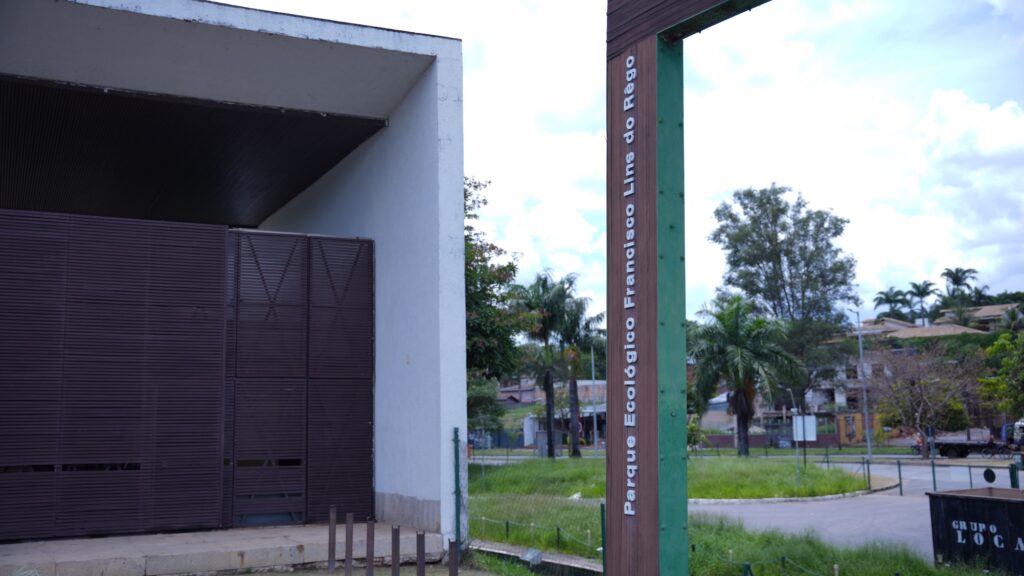 Portão do Parque Ecológico da Pampulha, localizado na região da Pampulha, em Belo Horizonte. Em primeiro plano, uma placa com os dizeres “Parque Ecológico Francisco Lima do Rêgo”, nome do Parque Ecológico da Pampulha. Ao fundo, a entrada do parque