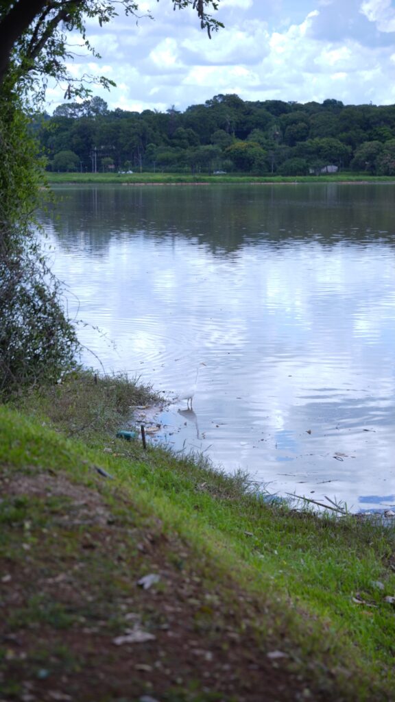 Garça dentro da Lagoa da Pampulha, na região da Pampulha, em Belo Horizonte. Ao lado do animal, boiam alguns dejetos de lixo. Ao fundo, uma outra parte da orla da lagoa.